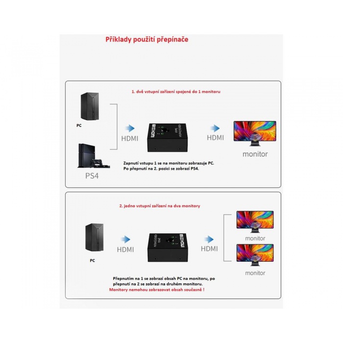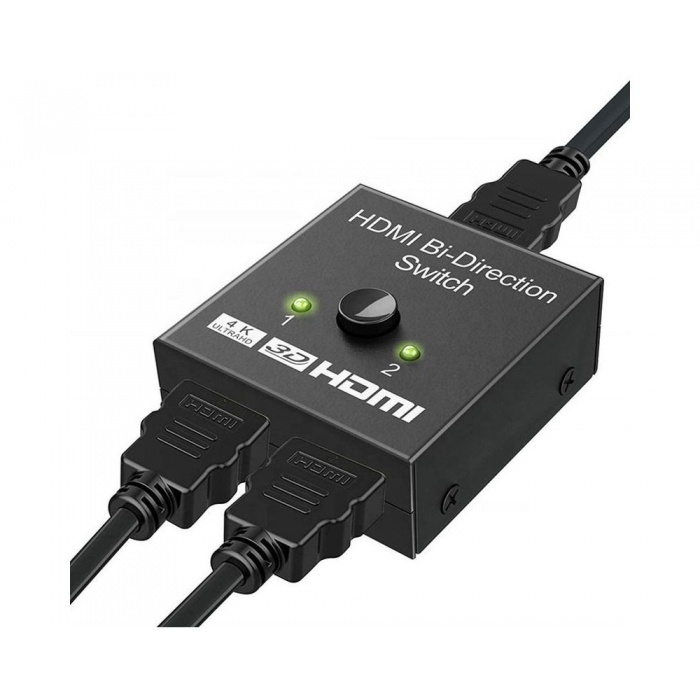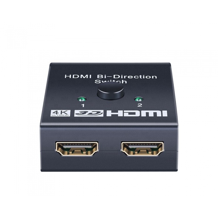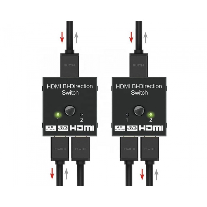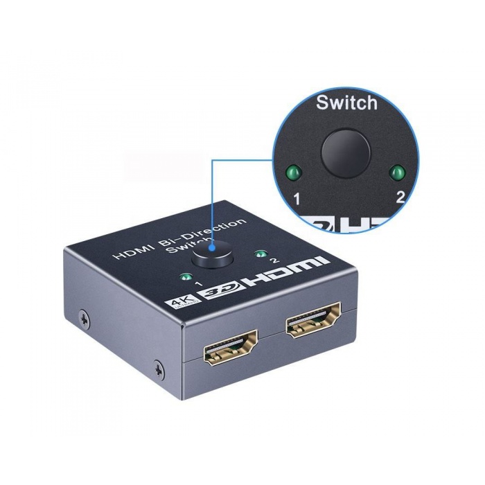 Obousměrný přepínač HDMI 4K umožňuje uživateli připojení dvou 4K ULTRA HD zdrojů pomocí kabelů s HDMI (např. přehrávače Blu-ray, herní konzole) na jeden 4K ULTRA HD monitor, televizi či projektor. Díky tlačítku na přepínači uživatel jednoduše určí, které vstupní zařízení ze spojí s monitorem, televizí nebo projektorem.