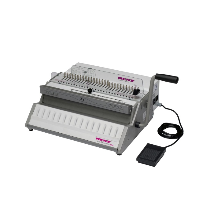 Pracovní šířka 360 mm, rozteč ok 3/1", děrovací kapacita 22 listů 80g papíru, rozměr děr 4x4 mm, max. rozměr hřbetu 16 mm, vyřaditelné nože, pohon děrování ruční + vysekávač CPW20.
